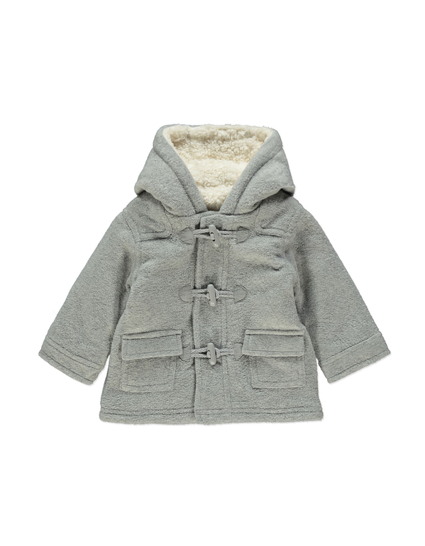 Новое Пальто даффлкот с капюшоном на мягенькой меховой подкладке фирмы George. Сезон прохладная весна-осень, это как толстая-толстая кофта. Верх - ткань типа флиса с ворсом, внутри куртки и капюшоне мягенький мех, внутри рукавов подкладочная ткань. Серый, накладные карманы, застежка-липучки + пуговицы. Состав полиэстер. Размер12-18мес (80-86), 990руб