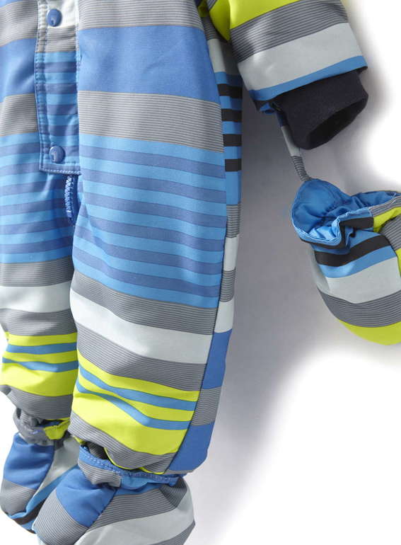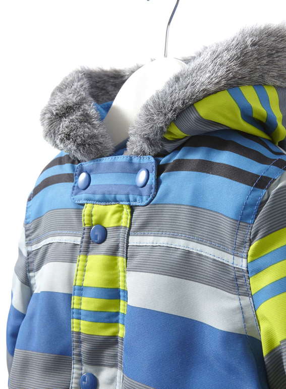 Новый Комбинезон еврозима, т.е. на нашу осень с капюшоном на флисовой подкладке фирмы Zip-Zap. Верх - болоневая мягкая ткань, средний слой синтепона, внутри куртки и в капюшоне флис , внутри рукавов подкладочная ткань. Ярко-голубые, салатовые, серые полоски, капюшон оторочен искусственным мехом. Застежка молния +кнопки, в рукавах трикотажные манжеты, пристегиваются пинетки и варежки. Состав полиэстер. Размер 3-6мес (68), 6-9мес (74)