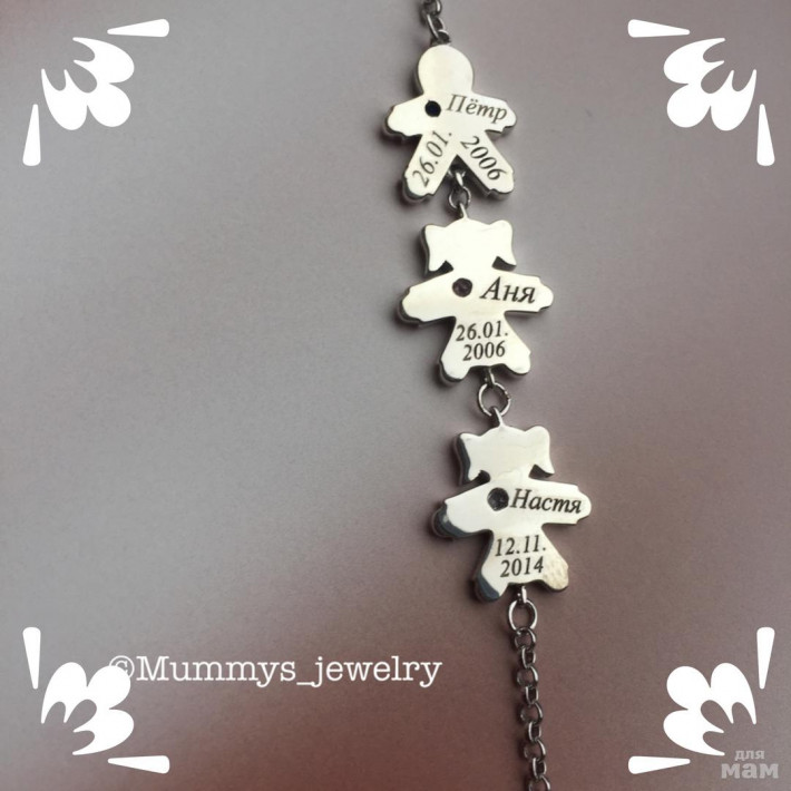 Все браслетики изготавливаются по индивидуальному дизайну.Каждая мама может выбрать ,каким будет ее украшение-из серебра 925 пробы с родиевым покрытием или золото 18К,с кулонами малышей полностью в камнях(фианитах бриллиантовой огранки),или с одним фианитом в сердечке.Именно благодаря такому индивидуальному подходу и рождается самое дорогое маминому сердцу украшение!