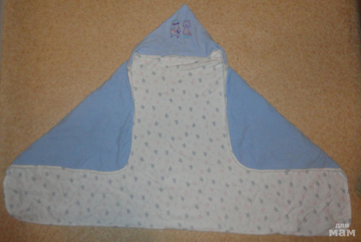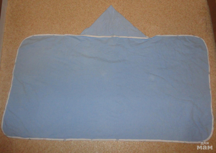 Внутренний слой - трикотажная хлопковая ткань, снаружи махровое, 100% хлопок. Капюшон украшен вышивкой, края изделия обшиты тесьмой. Размер 60х120, большое, хватит надолго.