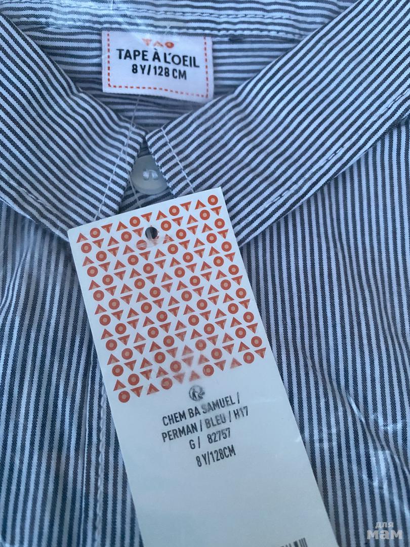 Рубашка с длинным рукавом фирмы t-a-o (Tape à l'oeil) Франция. Белая-синяя полоска, рукава фиксируются на хлястик с пуговичкой в подвернутом виде . Состав 100% хлопок.