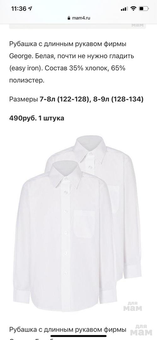 Рубашка с длинным рукавом фирмы George. Белая, почти не нужно гладить (easy iron). Состав 35% хлопок, 65% полиэстер.