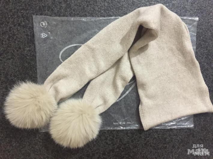 Красивый и теплый шарф Catya цвета топленого молока c натуральным помпоном и стразами. Цена 3500