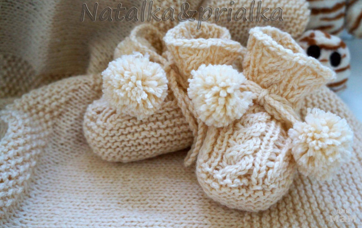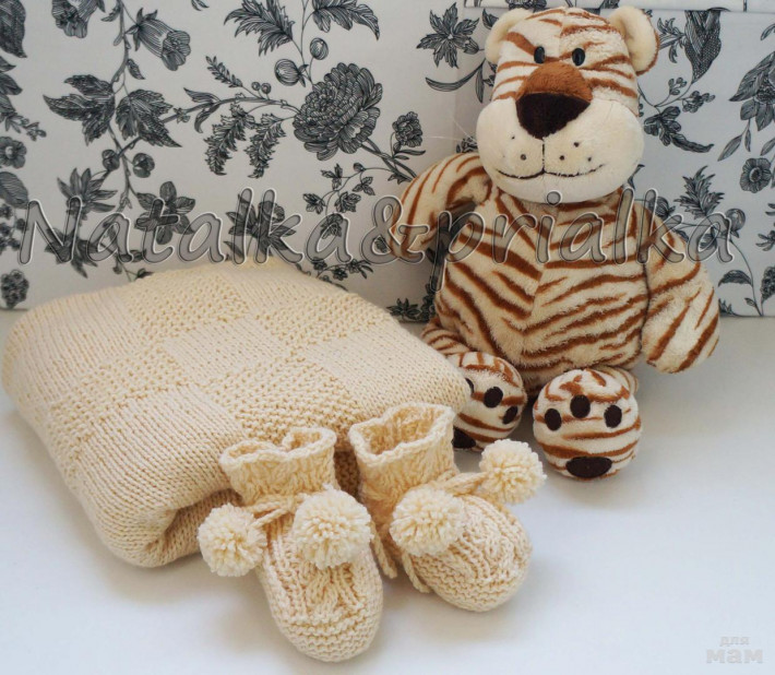 Большой квадратный плед и пинетки связаны из гипоаллергенной пряжи, предназначенной именно для детских изделий (состав 20% мериносовой шерсти, 80% акрила).