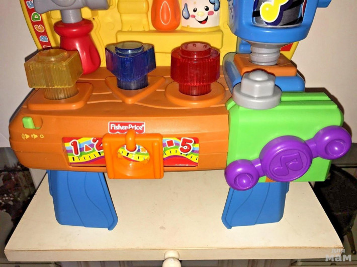 Он сможет тереть, стучать, крутить, скользить и даже вращать в ходе изучения алфавита, цифр, форм, цветов, противоположностей и действий. 3 разных интерактивных режима обучения, пройти которые помогут многочисленные инструменты, приведут волшебный верстак в действие. В это время развлекать малыша будут более чем 15 разных мелодий и звуков, среди которых как живая музыка, так и фразы и смешные мелодии. Здесь ребёнок сможет кружиться в танце, вращать специальные тиски, вертеть валиком, играть в игру «Считай и показывай» и стучать молоточком. Во время прикосновения к колышкам у него появится возможность выучить считалочку. Разработан контроллер громкости и режим «тихой игры».
