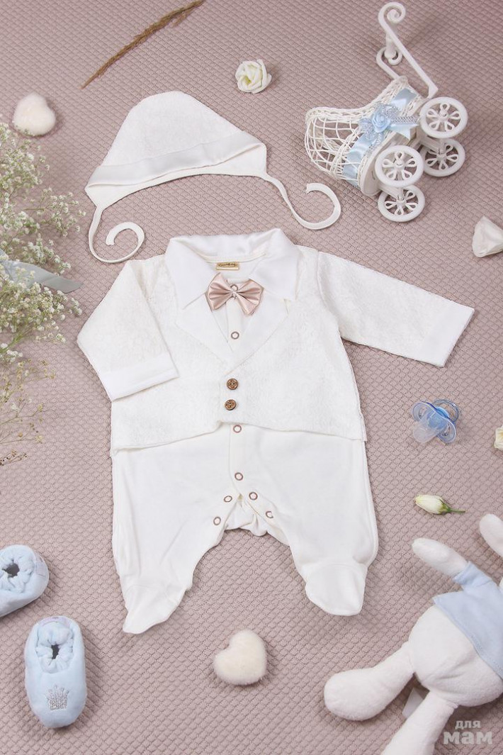 От себя: комплект потрясающий, качество на высоте. Отделка жакета - тонкое кружево, декор - маленькие деревянные пуговки. Элегантная бабочка из атласа. Воротничек с жаккардовым узором. В комплекте идет чепчик с кружевом. Чепчик декорирован даккардовой вставочкой. Комплект выполнен в молочном цвете. К сожалению фото не передает красоты кружева на жакете.
