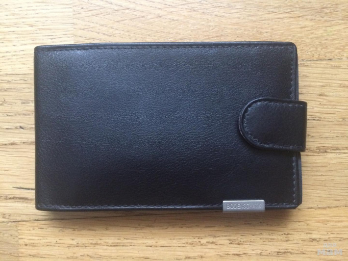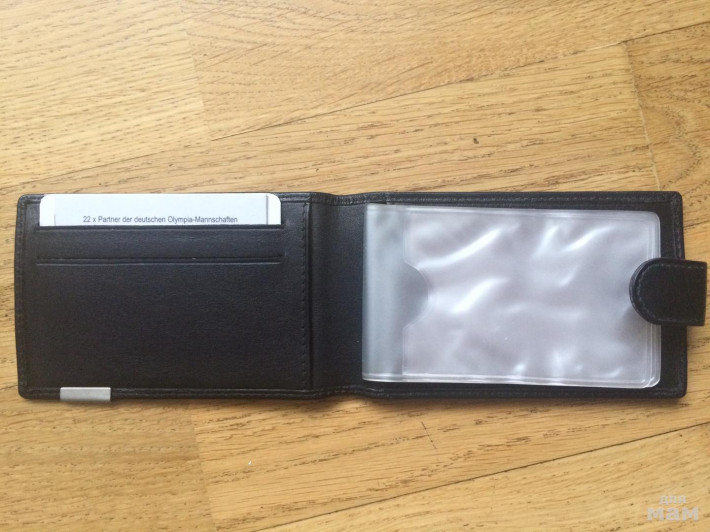 Закрывается клапаном на кнопку, внутри блок прозрачных файлов для визитных карточек (восемь листов - вмещает 16 карточек), два кармана для пластиковых карт, два потайных кармашка.