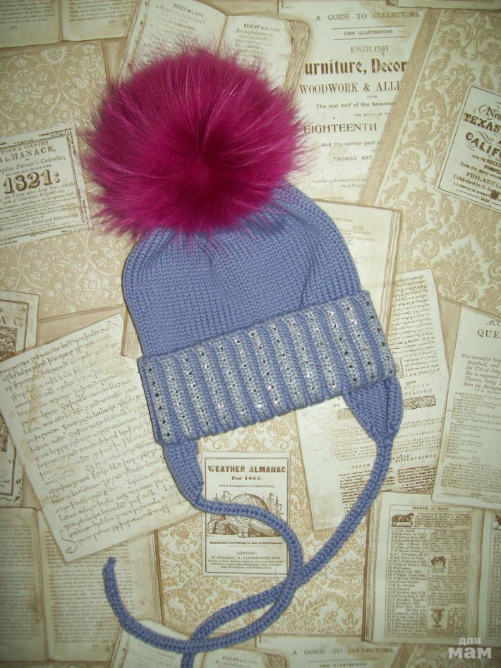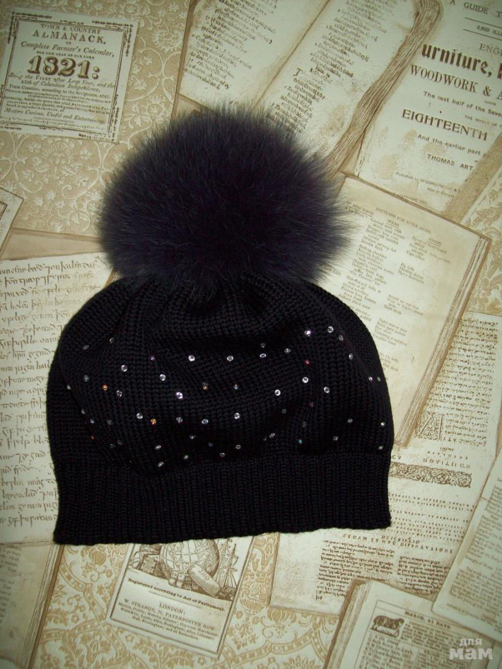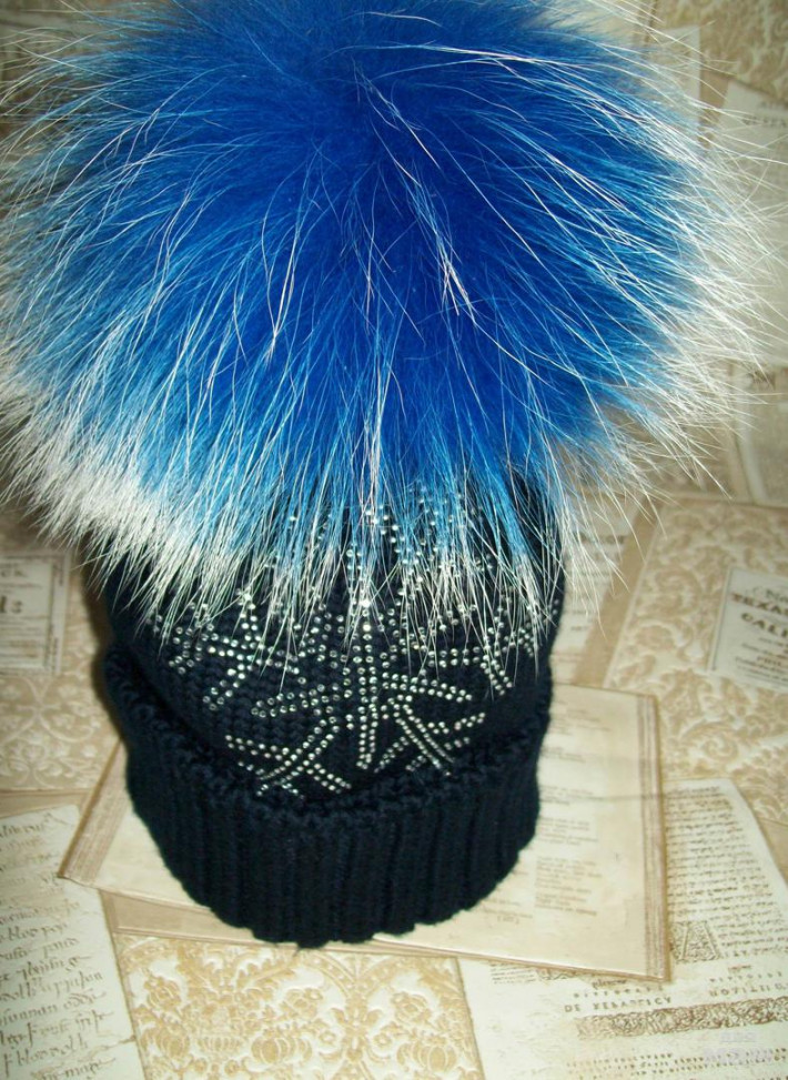Темно-синяя. меринос в две нити. Вязка лапшой. помпон из финского енота. 19 см. ОГ с 48 и до 52. 1700 р.