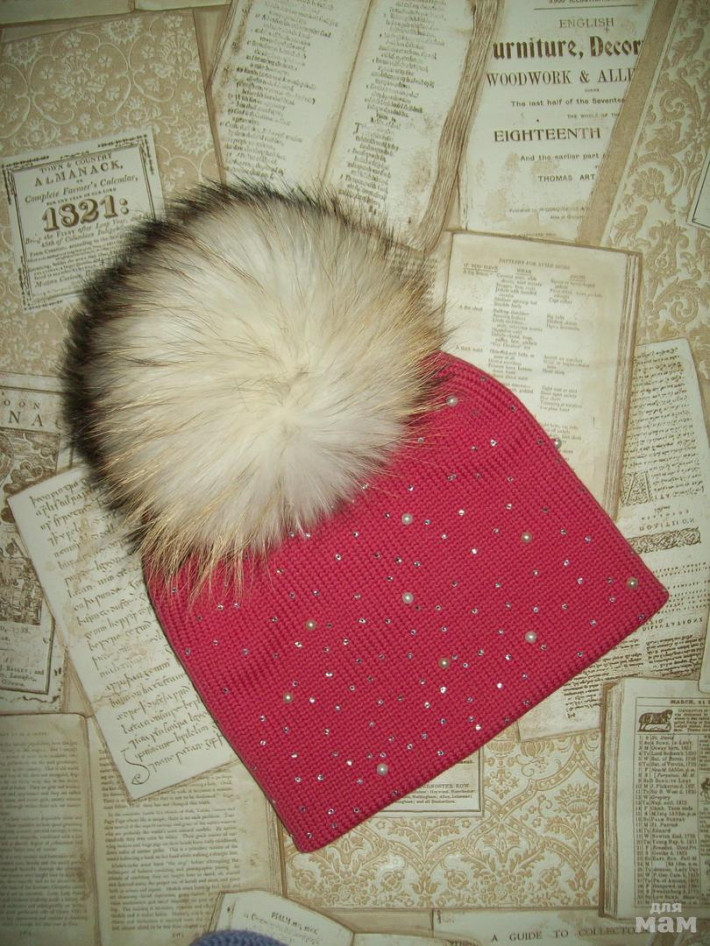 Меринос с производства миссони. Коралловый. декор стразы и жемчуг. В два слоя. ОГ 52-55. Прекрасный вариант маме или в школу. Помпон 19 см. - 1800