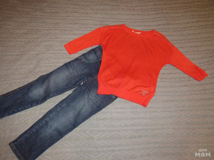 Очень классный кораллово-красный тончайщий свитерок Guess, как у мамы (точно такая же модель, как и во взрослой коллекции), рукав укороченный, выглядит сногсшибательно (на фото не удалось передать его прелесть))). На стройняшку!