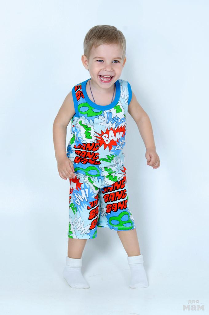 100% хлопок. Ткань легкая, немнущаяся, гипоаллергенная, отлично пропускает воздух. Яркий, свободный летний костюм для мальчиков с 11 месяцев до 7 лет.Размеры: 52, 64, 72. цена 210 рублей