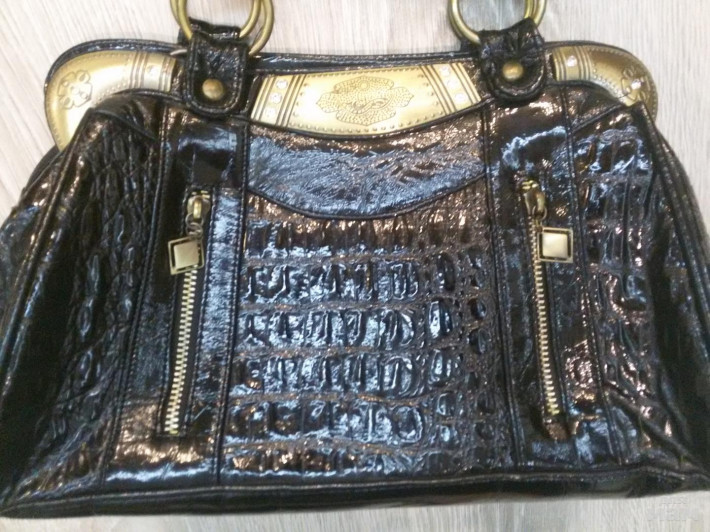 Сумка, черный лак. Б.у. Оень красивая с металлческой фурнитурой и стразами.Внутри молнии не работают, соскочили бегунки. Размеры 32х18см