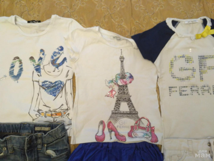 3 майки Ферре, джинсы-скинни Ральф Лорен, юбки в подарок. На майке в центре есть нюанс-пара малюсеньких пятнышек. Две по краям в идеале. На джинсах в районе колена дырочка 1-2 мм. На стройную девочку я бы рекомендовала. За все 2500руб.