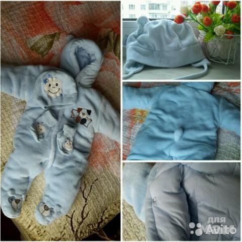 1. комбинезон на выписку и до роста 62 см максимум. толстый, подклад хлопок. Вязаная шапочка на хлопковом подкладе и носки пинетки подбирались отдельно, продаю комплектом с комбезом за 800 руб. шапочка Kerry с хлопковым подкладом и утеплителем на голову до 46 см-300 руб, если все вместе, что на фото с комбезом-1000 руб