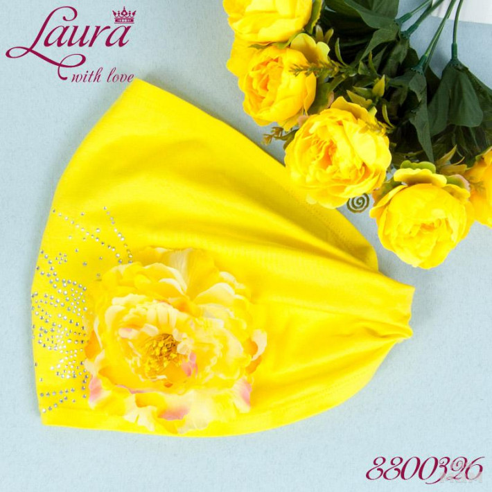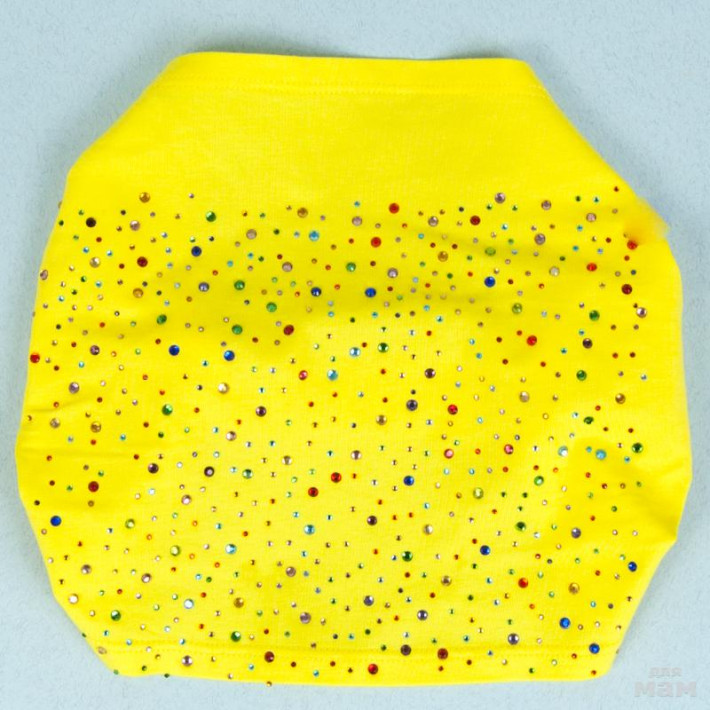 Бандану желтого цвета украшает россыпь разноцветных страз разного размера. Невероятно красивый эффект, косынка будет вся переливаться на солнце.