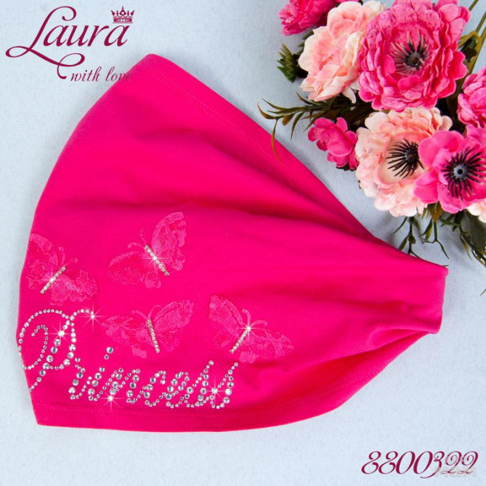 Бандану ярко-розового цвета украшает надпись из страз "Принцесса". Вокруг надписи летают объемные бабочки из гипюра. Очень эффектная композиция!3