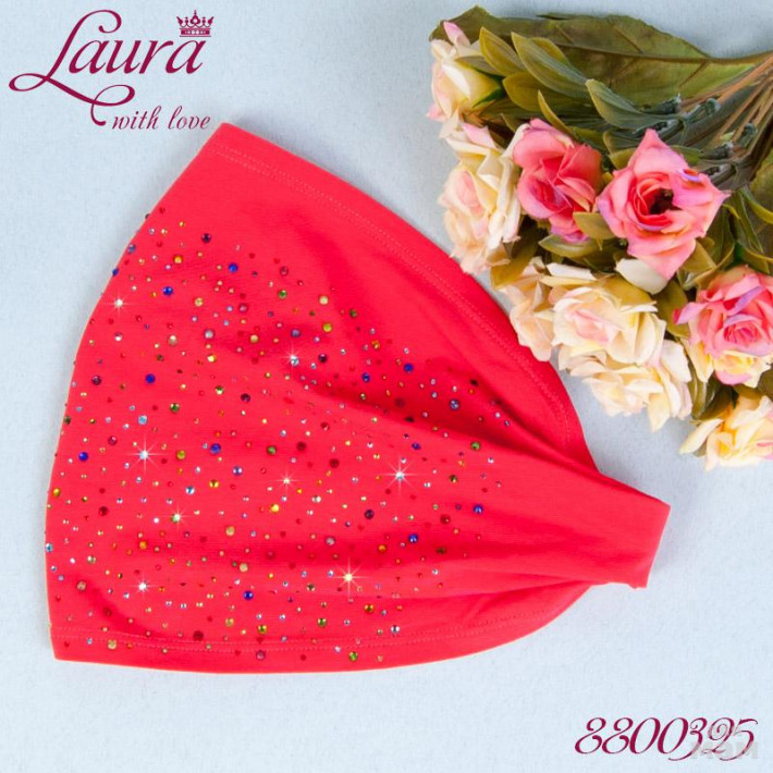 Бандану кораллового цвета украшает россыпь разноцветных страз разного размера. Невероятно красивый эффект, косынка будет вся переливаться на солнце.