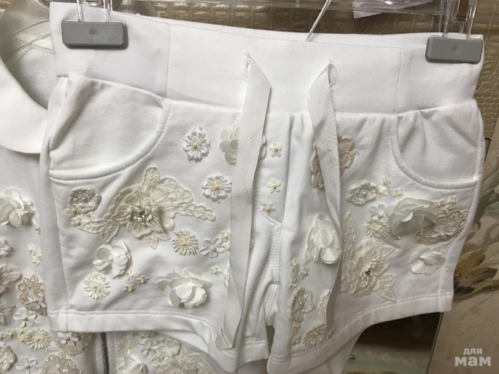 Шикарный костюм топ на молнии 3 четверти рукав и шорты ,покупала в предзаказе очень дорого,так как цветочки и украшения ручной работы.