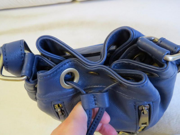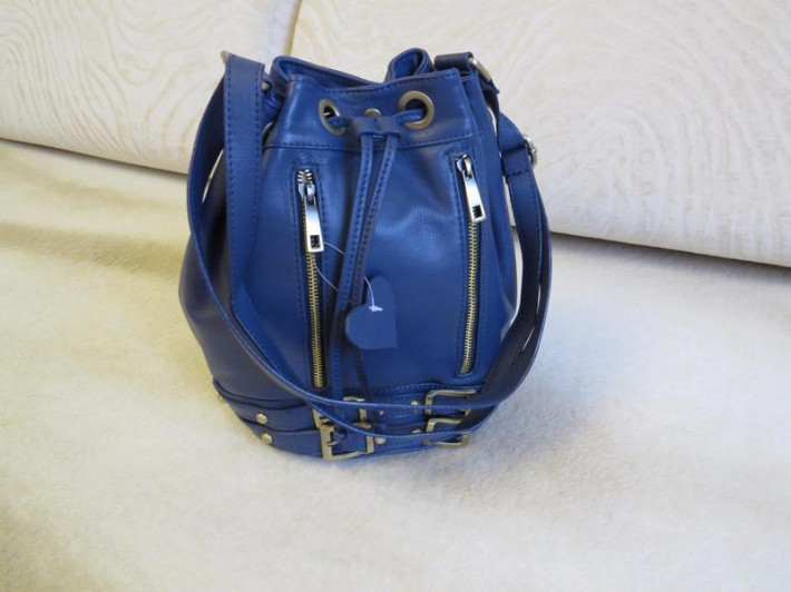 221 Синяя, 3 отделения, 1 на молнии, сбоку на кнопках, длинный ремешок в комплекте. Размер 32*24*14 см, цена 5700 руб