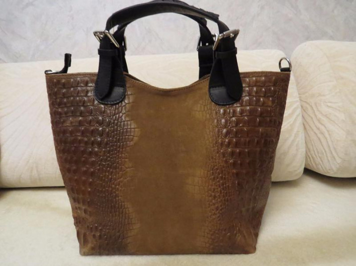 218 Сумка в шоколадном цвете. Внутри 1 отделение, боковой карман на молнии, длинный ремешок. Дно 12, высота посередине 26 см, сбоку 32 см, ширина 38 см. Цена 5600 руб. Сумка мягкая.