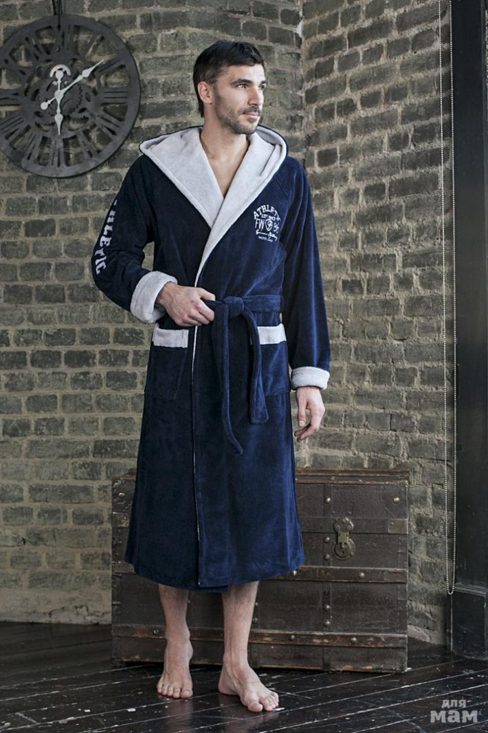 1.Удлиненный спортивный бамбуковый мужской халат на запахе с капюшоном. Вышивка на рукаве и груди. Спортивная классика для настоящих мужчин. Удобный, практичный, стильный халат для дома.