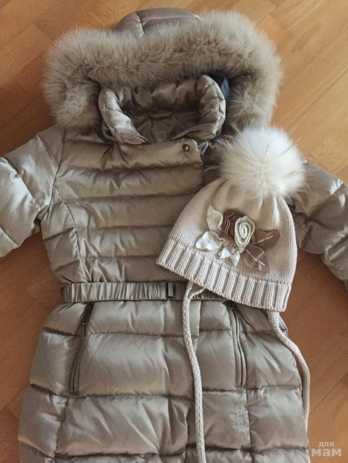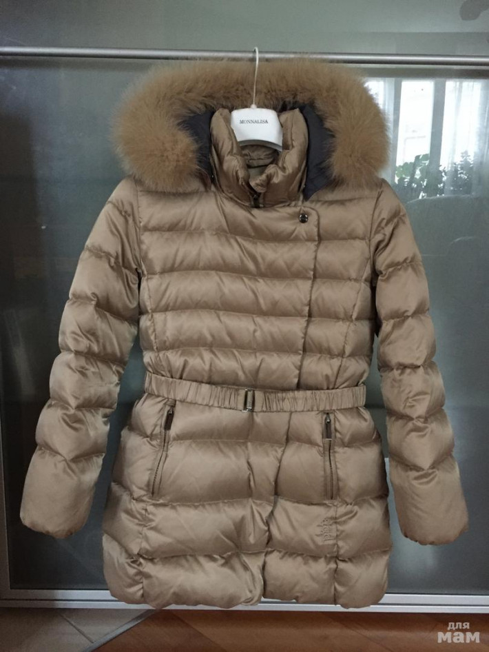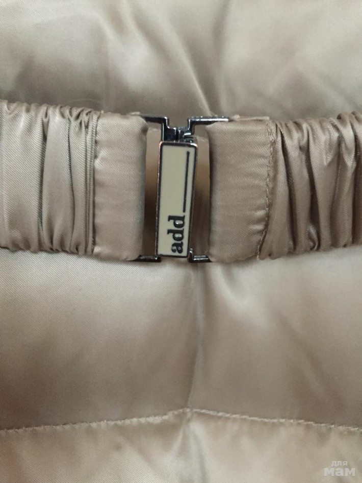 В отличном состоянии, р. 10, можно носить на рост 134-146, пух 90/10, хорошая набивка, ткань сатин чуть с блеском. Цвет бежево-золотистый.