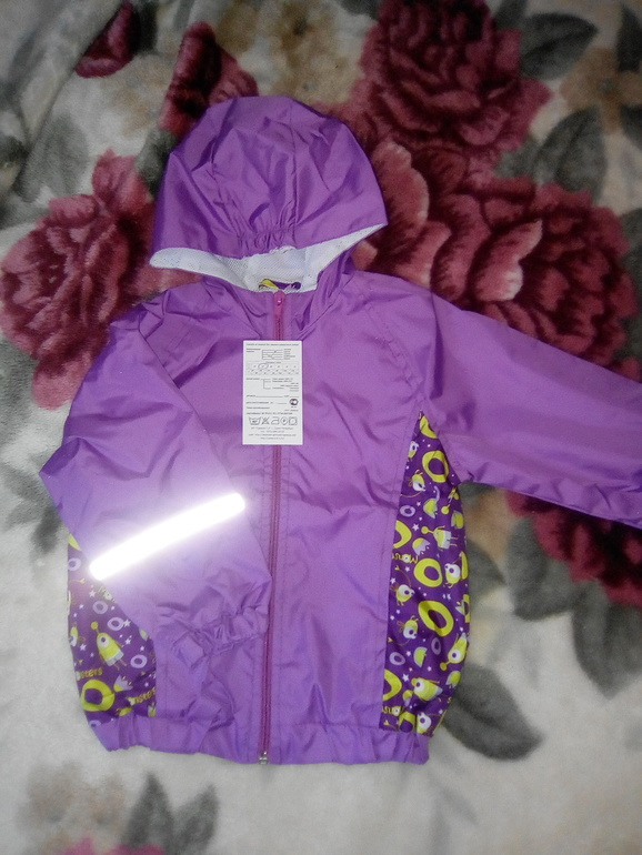 4. Ветровка Верх -Дьюспа-принт, подклад-сетка п/э трикотажная. рукав, низ изделия и капюшон-на резинке, по рукаву-светоотражайка. Цена 750р. Размер 86-92.