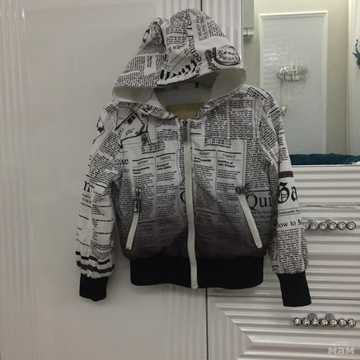 Куртка Гальяно газета наша самая любимая вещь!!!. Модель, с переходом цвета в чёрный , очень эффектно смотрится . Размер 36 мес, мы носили до 104см. Качество отличное !!! Состояние отличное . Резинки не растянуты. Из нюансов есть катушки на резинке как на трикотаже , но они не заметны .