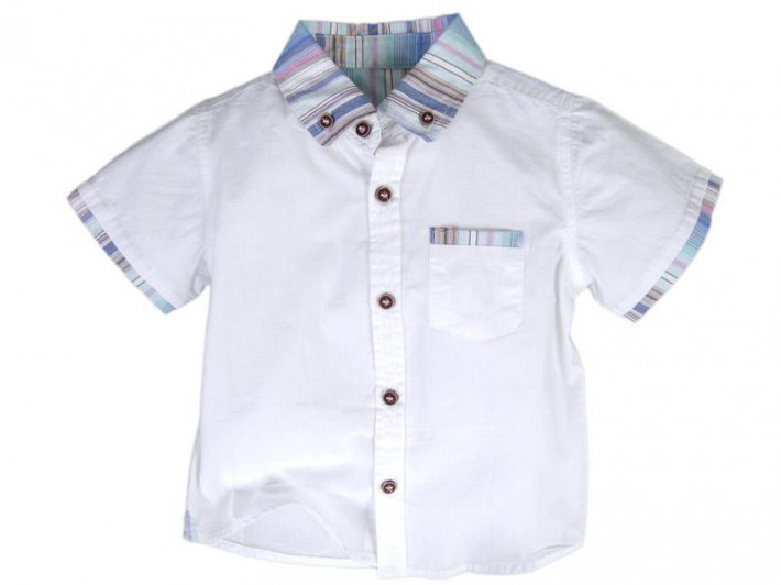 Хлопковая рубашка для мальчика в мелкий горох. Она отлично будет смотреться с джинсами или с брюками. Контрастный воротничок и манжеты добавляют дополнительный эффект рубашке. На груди вышит логотип бренда.