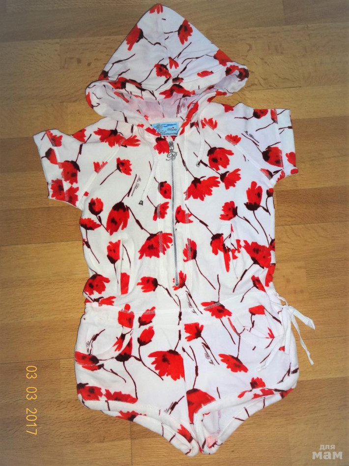 Хлопковый,махровый комбинезон,в капюшоне шелковая подкладка..состояние отличное ,на девочку среднего телосложения можно носить с роста 120 до 130см.
