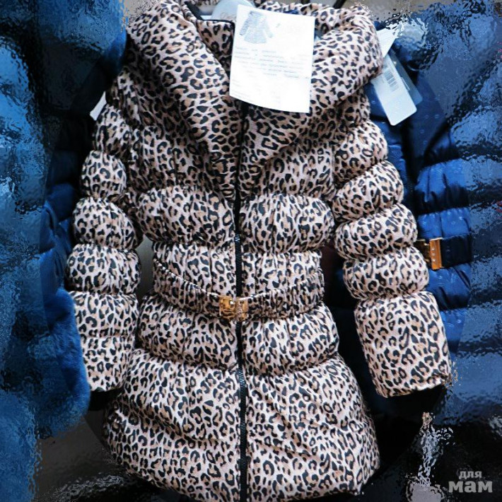 Пальто для девочки с леопардовым принтом, с капюшоном. На поясе фиксируется ремнём. Внизу модели в боковых швах два прорезных кармана на молнии. Манжеты модели выполнены из трикотажной резинки.
