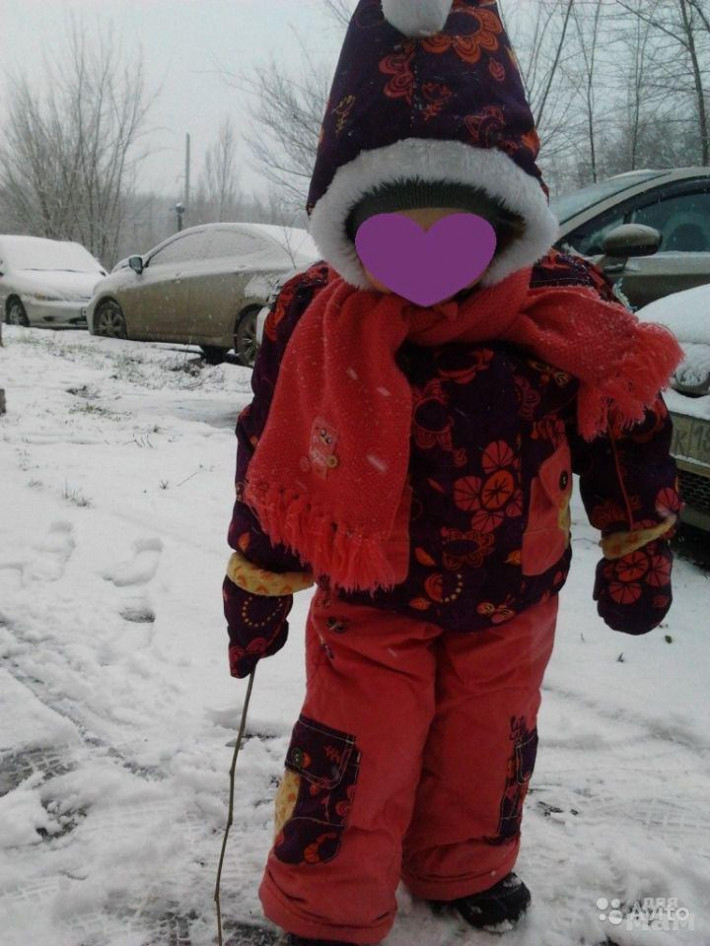 маркировка указана 2т, но большемер, мы носили с роста 86 ( с подворотом штаников) и до 100. состояние очень хорошее, на твердую 4-ку. К комбезу идут варежки (пристегиваются к комбезу кнопками), шапочка и шарфик. в комплекте все продумано до мелочей, носили с огромным удовольствием до -15 смело на маечку, легкий свитерок и колготы, не продуваем. пересыл пополам