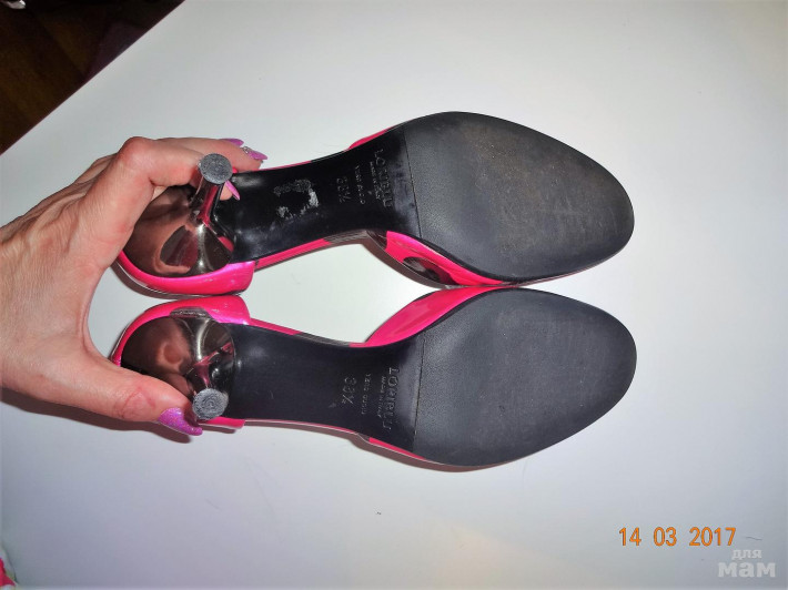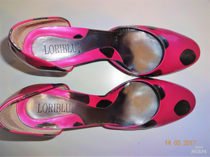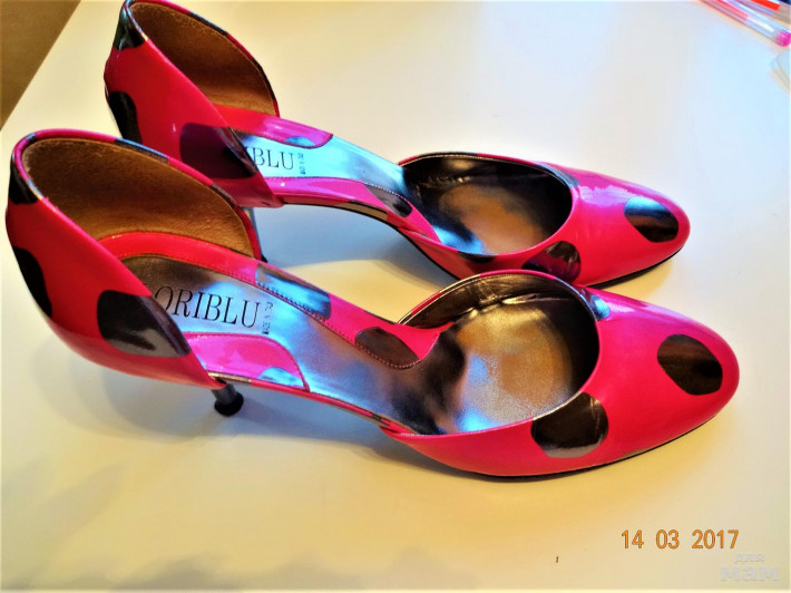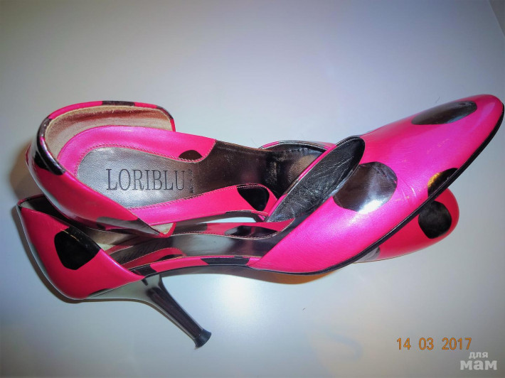 Кожаные туфли цвета фуксии с зеркально-черными пятнами.Надеты пару раз,сосояние отличное.Чуть потерта стелька,набойки родные в отличном состоянии.Каблук 8см.Куплены в Риме очень дорого.