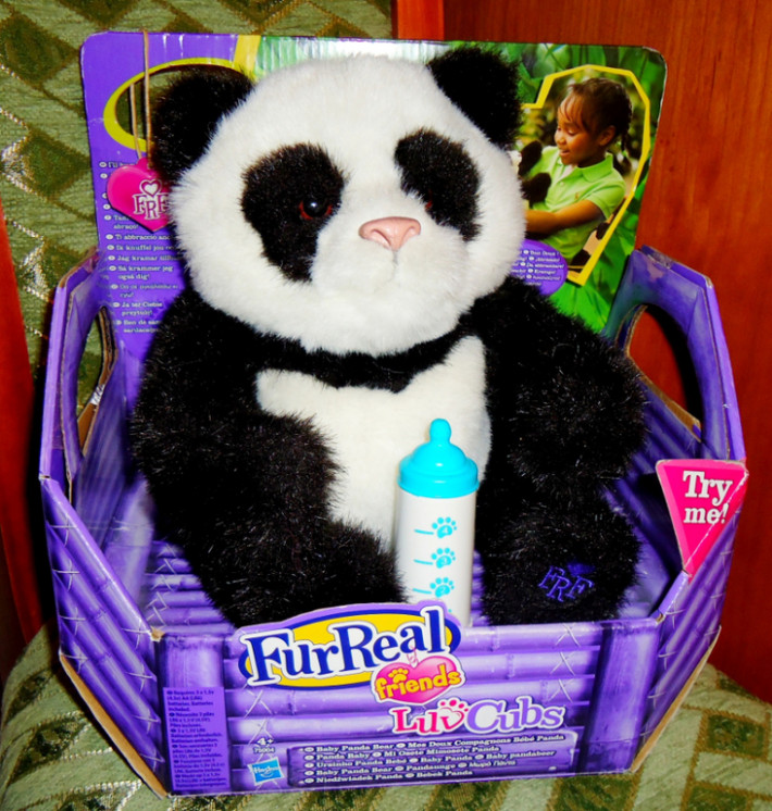 6. Игрушечная панда - это интерактивный друг от Hasbro - он не только может двигать лапками и бровями, он будет настоящим любимым питомцем и другом. Эта веселая панда смеется, обнимается, ее можно покормить из бутылочки. Ей так вкусно, что при кормлении она даже довольно причмокивает. Встроенные сенсоры позволят панде обрести способности настоящего питомца. Если вы полюбите этого малыша он тоже ответит вам любовью. Игрушка подойдет детям от 4-х лет, она работает от 3-х батареек типа АА, входят в комплект.. Цена: 2800 р.
