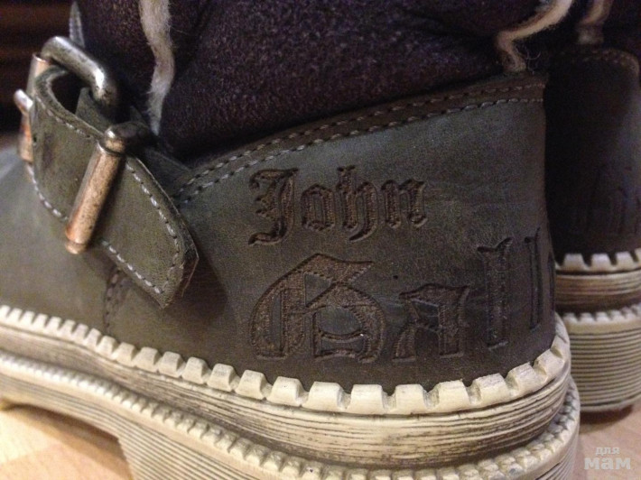Изумительные сапожки John Galliano, оригинал, р.34, состояние отличное, но запнулся и повредил резину на мыске. На фото получились намного хуже, чем есть в реальности! Камера плохая( Точки и пятна-тоже дефект телефона. Подошва с эффектом старения. По меху и подошве видно, что носили очень мало, не успели, быстро малы стали(( Можно и девочке.