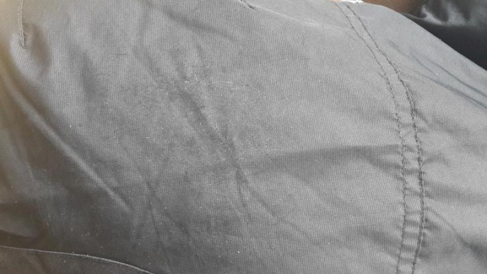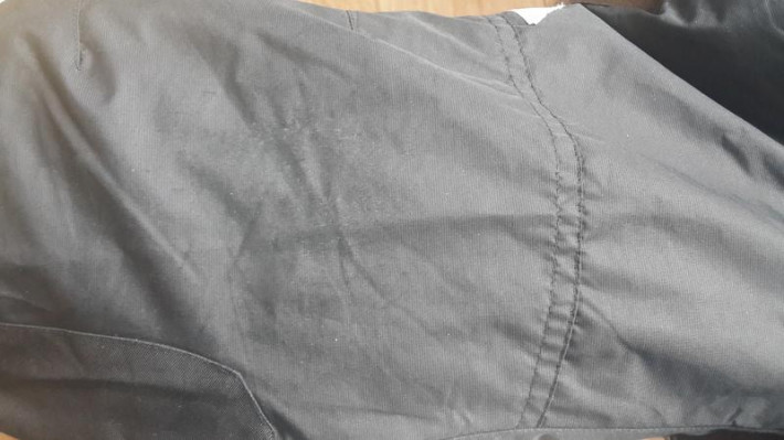 Колени, не большие потертости. без дырок.