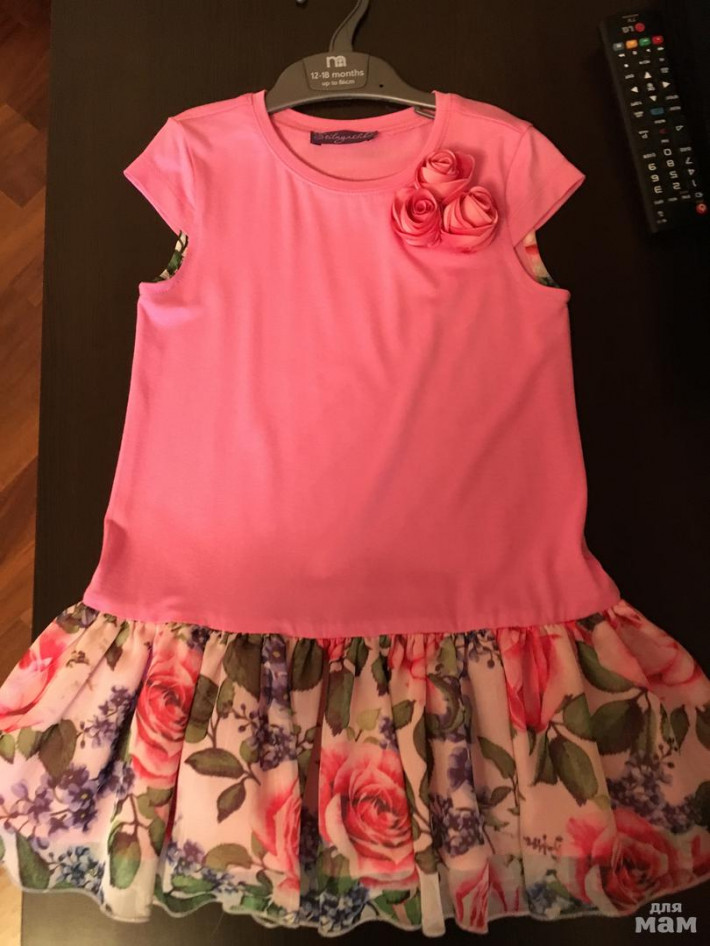 - НОВОЕ платье «Стильняшка» с цветами, на мой взгляд маломерит - на рост 106-110см. (по маркеровке 116см.) Замеры: длина - 57 см., полуобхват груди - 31 см. Тонкий трикотаж, юбка из шифона с воланами в 2-а ряда. Цена: 1300 руб.