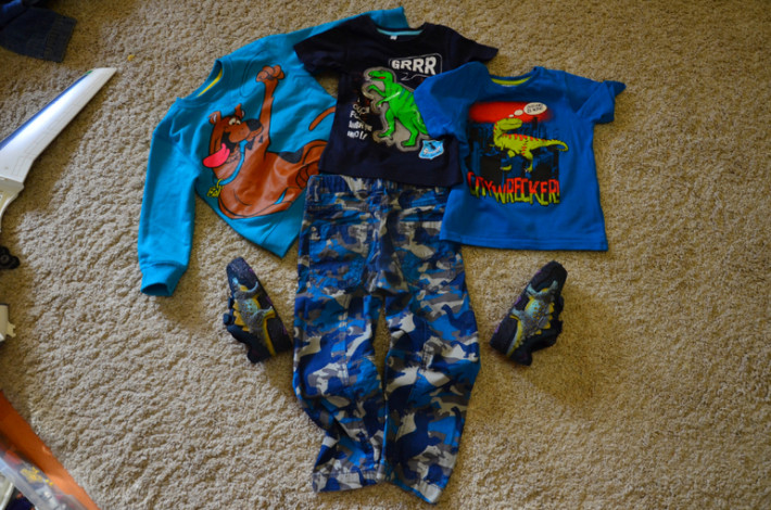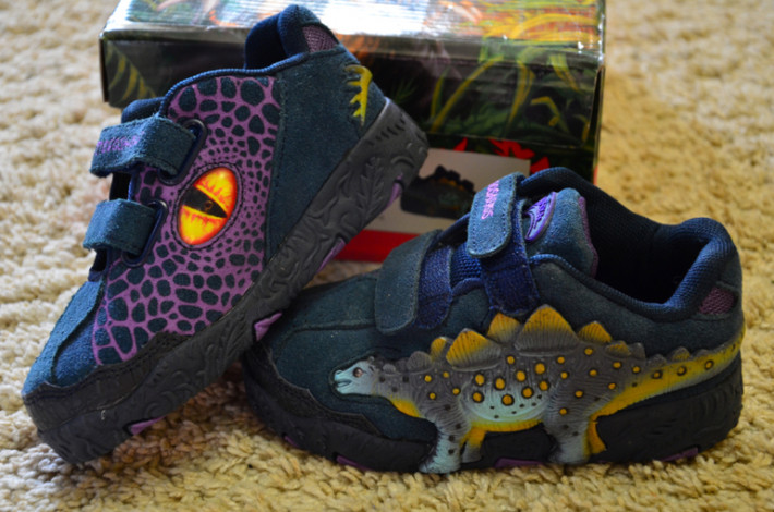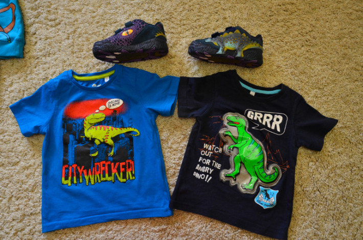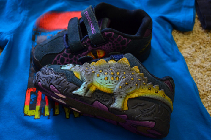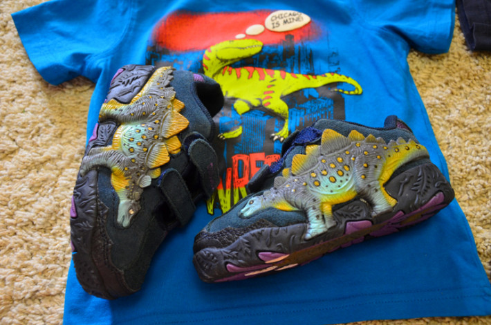 На темно-синей футболке динозавр изначально мигал при нажатии-сейчас не мигает, возможно, батарейка села-что бы ее поменять, надо отпарывать животное))