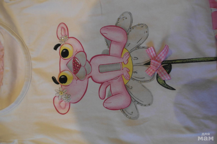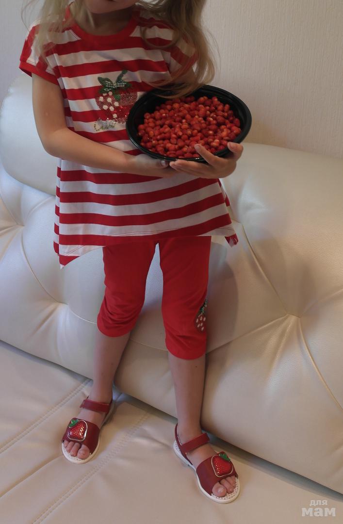 Комплект с клубниками разм.114, на фото примерно 116, если бы не худоба, м.б. пораньше одеть
