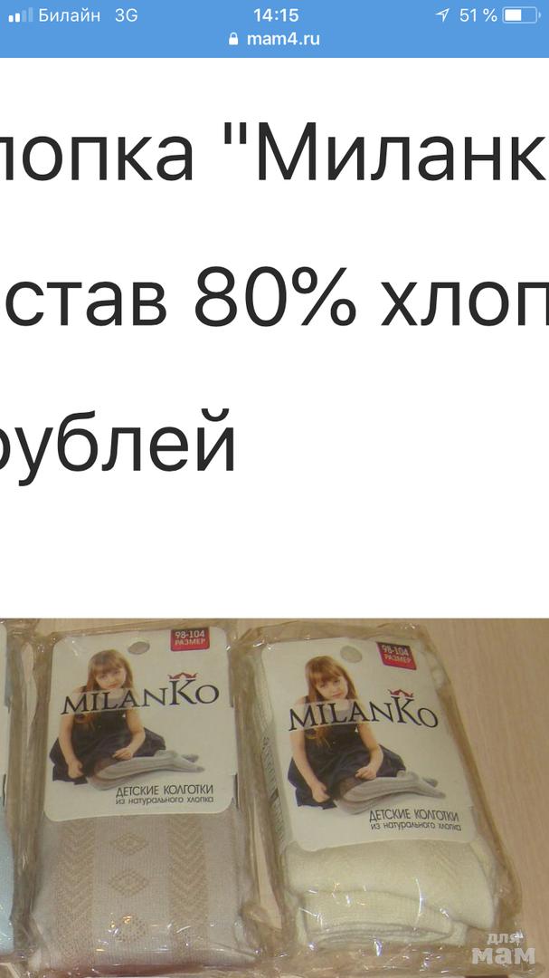 - Колготки из хлопка "Миланко" размер 128-140, состав 80% хлопок, 20% эластан, 110 рублей