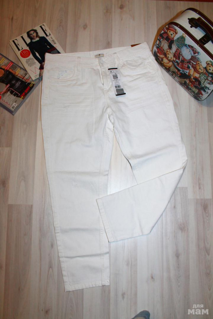 белые укороченные джинсы бойфренды, очень крутые, на невысокую девушку до 1,60м будут до щиколотки, лучше сядут на высокую, европ 40р-р - росс 46, но и на 48 нормально,