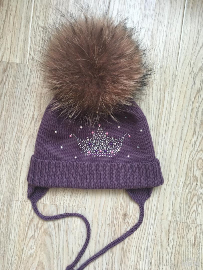Зимняя шапка из итальянского мериноса(двойная+отворот) с большим помпоном из натурального меха енота для девочки от 3 до 5 лет (на ОГ 51-53см). Состояние отличное