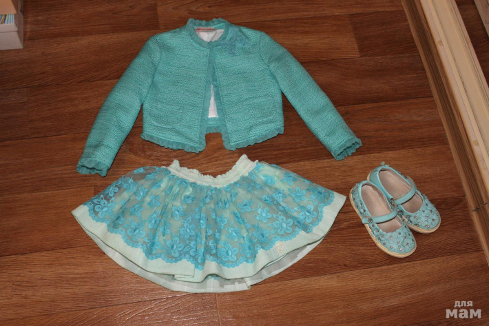 Комплект Miss Blumarine/ Юбка 2А (реально на 3-4 г.), пиджак 3А (на 3-4 года). На рост 106 сидит очень хорошо. В комплекте туфли miss blumarine 26 размер.