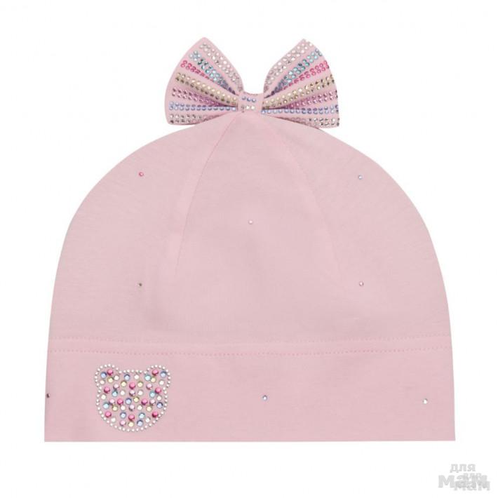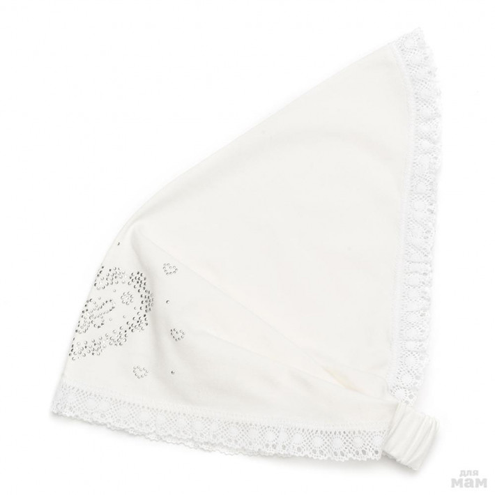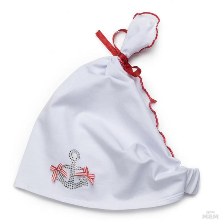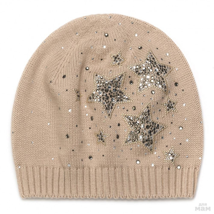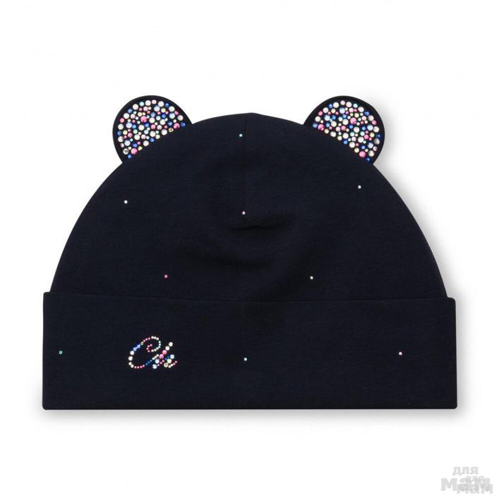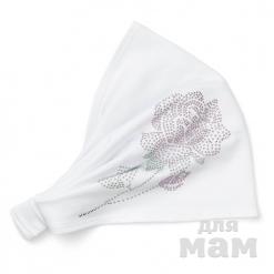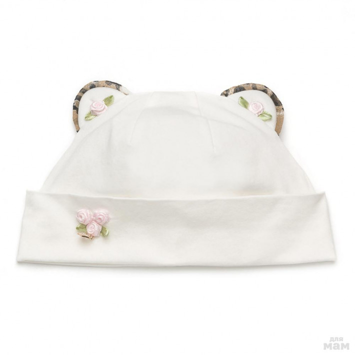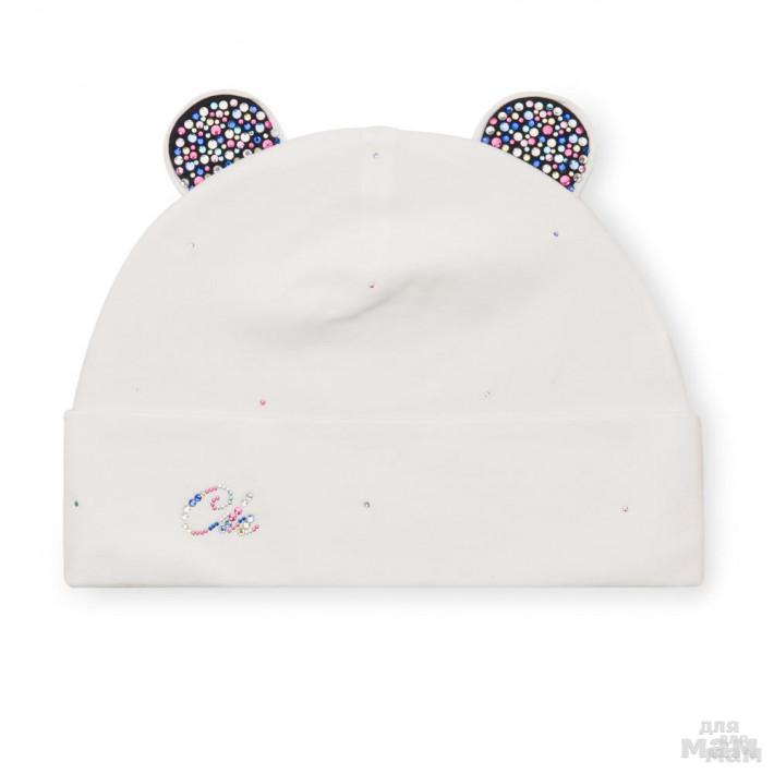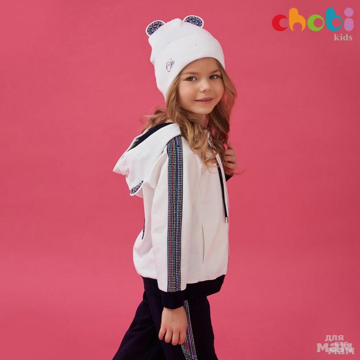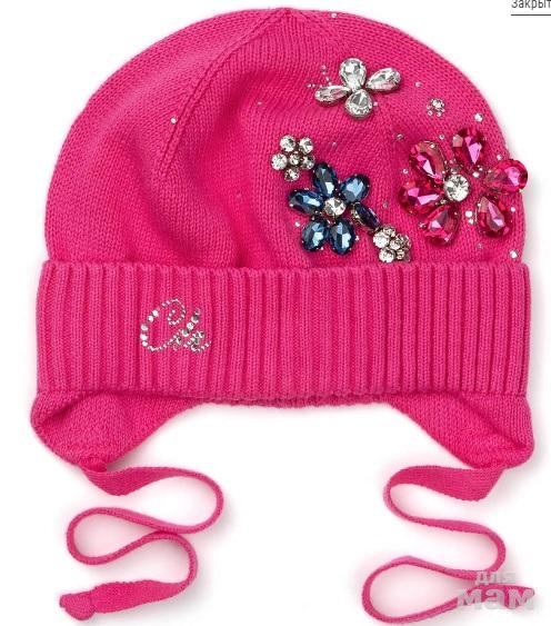 Шапка эксклюзивного дизайна связана из мягкой хлопковой пряжи и дополнена широким отворотом. Модель имеет вывязанные ушки и завязки, обеспечивающие защиту от прохладного ветра. В качестве декора дизайнеры бренда использовали крупные фантазийные камни, создающие композицию из цветов. Изделие входит в линию Chobi Chic
