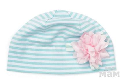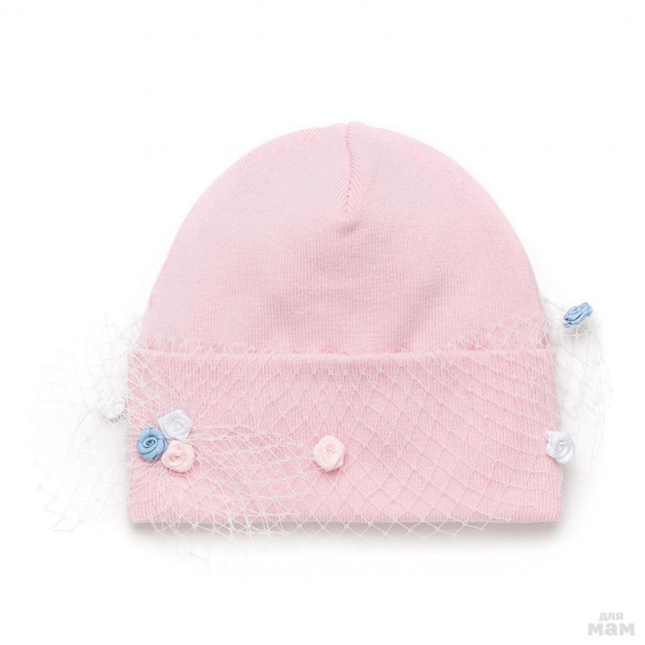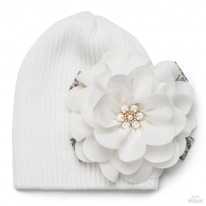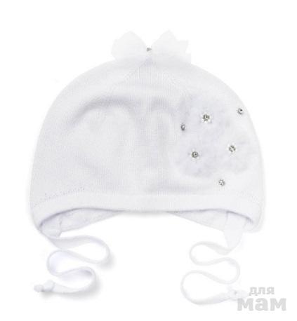 Вязаная шапка из мягкого гипоаллергенного хлопка дополнена завязками, защищающими ушки от прохладного ветра. Для декора модели был выбран воздушный фатин, собранный в цветочки ручной работы. Макушку шапочки украшает игривый бантик.