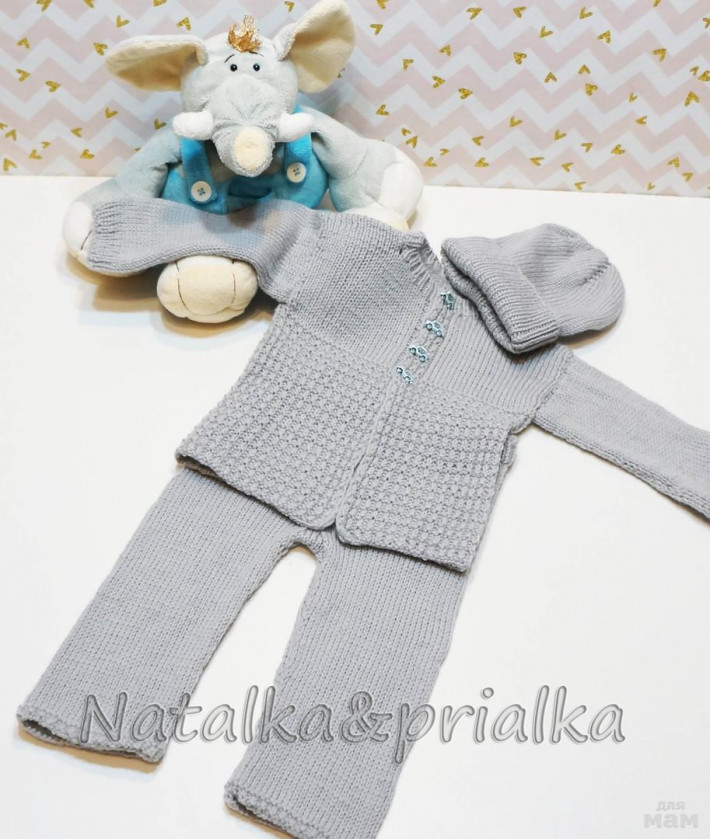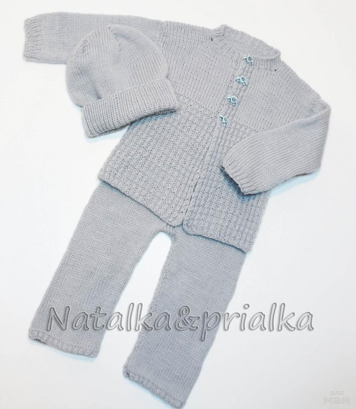 Кофточка застегивается на пуговки. На штанишках сзади увеличена высота резинки, за счет чего они не будут сползать, даже если подгузник уже пора поменять... Шапочка с мягкой резинкой, которая хорошо облегает голову и при этом сильно не давит.