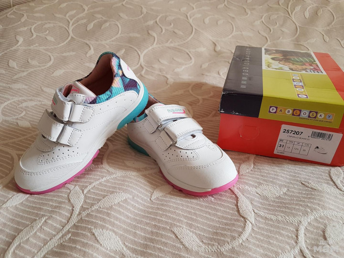 Пристраиваю перехап. Новые кроссовки от Pablosky 31 рр, по стельке 20 см. Изготовлены с использованием натуральной кожи и инновационного дышащего материала inTech, который способен впитывать влаги до 8 раз больше собственного веса. Стелька - со специальной пропиткой, позволяющей так же прекрасно поглощать влагу и предотвращать размножение бактерий. Модель имеет перфорацию для дополнительной вентиляции. Супер-гибкая резиновая подошва SUPERFLEX избавит от проскальзывания и добавит комфорта при ходьбе. В пяточную часть встроена анти-шоковая система AIRBAG, которая обеспечивает максимальное поглощение ударов и равномерно распределяет нагрузку на стопу.
