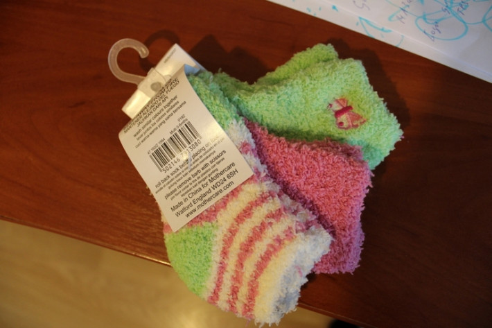 4.1 Marksandspencer Англия. Теплые флисовые носочки, очень мягкие, резинка свободная. Хорошо подходят для сна (у меня дочка точно в таких же спит). На подошве антискользящие капельки. Упаковка из 2 пар 390 руб.