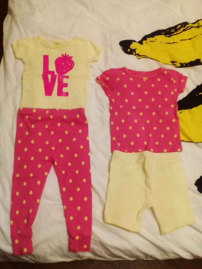 Пижама Carters р. 18 мес. Клубничка. 2 футболки с коротким рукавом, шорты и штанишки. Одевали раз 6. Было еще 3 комплекта. Состояние идеальное. Цвет розовый и желтый в полосочку. Можно носить с года.
