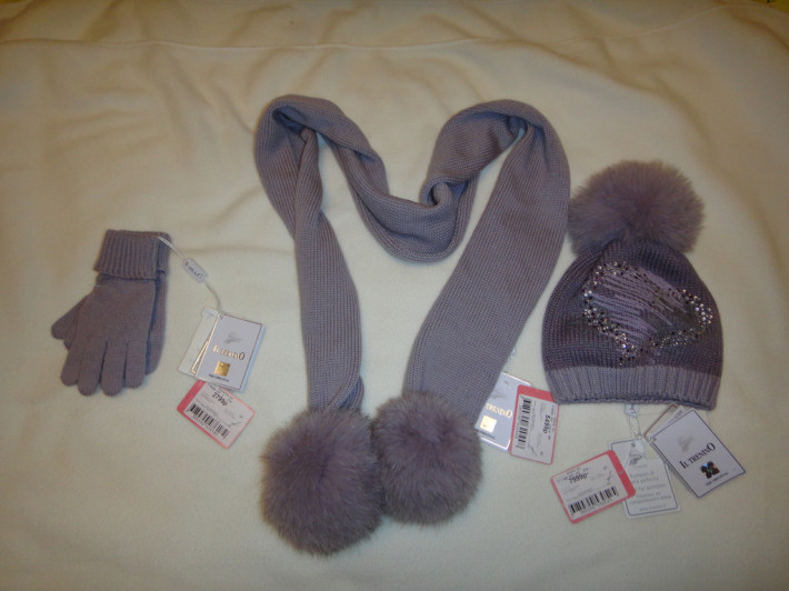 новый комплект с этикетками: шапка+шарф+перчатки размер 3 на 3-5 лет , фирма Il Trenino Италия. 100% шерсть, пумпоны писец. Цвет сиреневый, очень нежный. Шапка украшена стразами в виде сердца, все переливаются размер указан 3 это где-то 53 см. Смотрится шикарно.